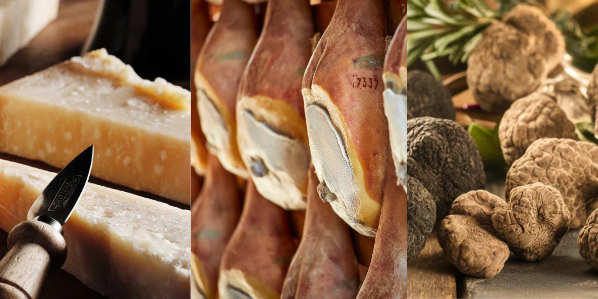 Parmigiano-Reggiano cheese, San Daniele ham and truffles.